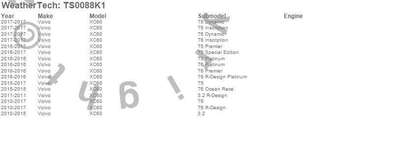 Below is an abbreviated list of applications for the WeatherTech SunShade Full Vehicle Kit.XC60, Volvo, 2017, 2016, 2015, 2014, 2013, 2012, 2011, 2010