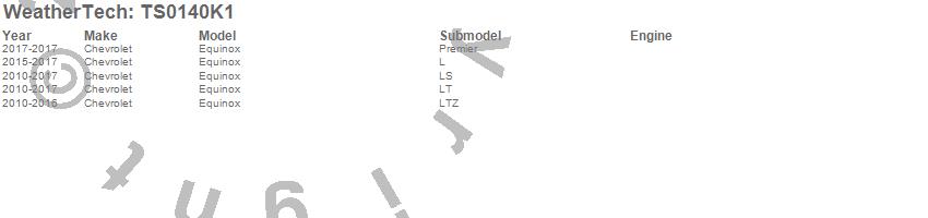 Below is an abbreviated list of applications for the WeatherTech SunShade Full Vehicle Kit.Equinox, Chevrolet, 2017, 2016, 2015, 2014, 2013, 2012, 2011, 2010
