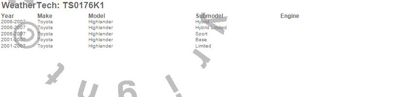 Below is an abbreviated list of applications for the WeatherTech SunShade Full Vehicle Kit.Highlander, Toyota, 2007, 2006, 2005, 2004, 2003, 2002, 2001