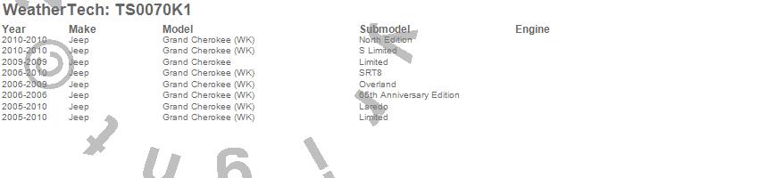 Below is an abbreviated list of applications for the WeatherTech SunShade Full Vehicle Kit.Grand Cherokee, Grand Cherokee (WK), Jeep, 2010, 2009, 2008, 2007, 2006, 2005