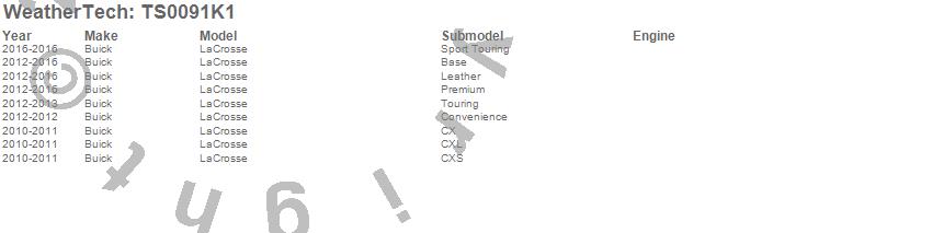 Below is an abbreviated list of applications for the WeatherTech SunShade Full Vehicle Kit.LaCrosse, Buick, 2016, 2015, 2014, 2013, 2012, 2011, 2010