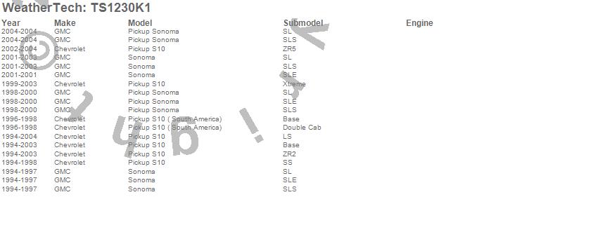 Below is an abbreviated list of applications for the WeatherTech SunShade Full Vehicle Kit.S10 Pickup, S10 Pickup (South America), Sonoma, Chevrolet, GMC, 2004, 2003, 2002, 2001, 2000, 1999, 1998, 1997, 1996, 1995, 1994