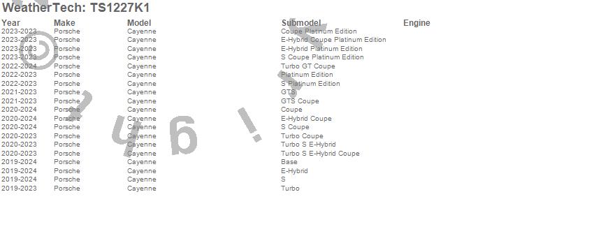 Below is an abbreviated list of applications for the WeatherTech SunShade Full Vehicle Kit.Cayenne, Porsche, 2025, 2024, 2023, 2022, 2021, 2020, 2019
