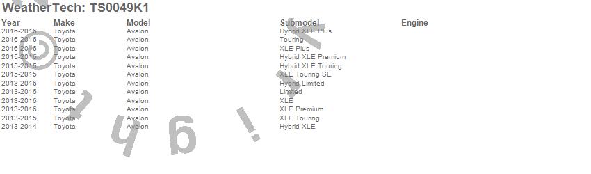 Below is an abbreviated list of applications for the WeatherTech SunShade Full Vehicle Kit.Avalon, Toyota, 2016, 2015, 2014, 2013