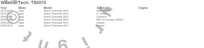 Below is an abbreviated list of applications for the WeatherTech SunShade.Grand Cherokee (WK), Jeep, 2010, 2009, 2008, 2007, 2006, 2005