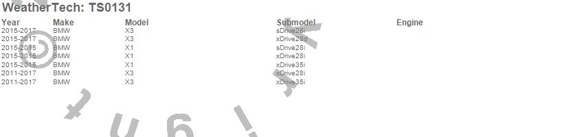 Below is an abbreviated list of applications for the WeatherTech SunShade.X1, X3, BMW, 2017, 2016, 2015, 2014, 2013, 2012, 2011