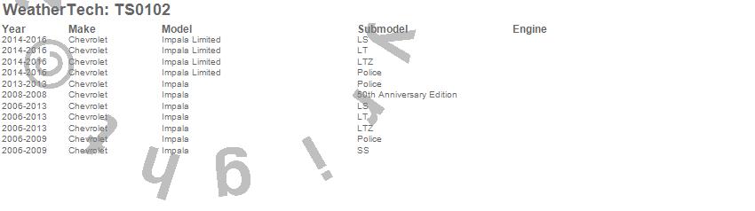 Below is an abbreviated list of applications for the WeatherTech SunShade.Impala, Impala Limited, Chevrolet, 2016, 2015, 2014, 2013, 2012, 2011, 2010, 2009, 2008, 2007, 2006