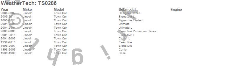 Below is an abbreviated list of applications for the WeatherTech SunShade.Town Car, Lincoln, 2011, 2010, 2009, 2008, 2007, 2006, 2005, 2004, 2003, 2002, 2001, 2000, 1999, 1998