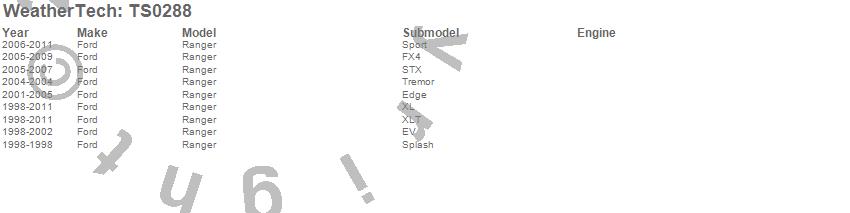 Below is an abbreviated list of applications for the WeatherTech SunShade.Ranger, Ford, 2011, 2010, 2009, 2008, 2007, 2006, 2005, 2004, 2003, 2002, 2001, 2000, 1999, 1998