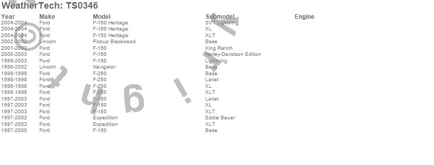 Below is an abbreviated list of applications for the WeatherTech SunShade.Blackwood, Expedition, F-150, F-150 Heritage, F-250, Navigator, Ford, Lincoln, 2004, 2003, 2002, 2001, 2000, 1999, 1998, 1997