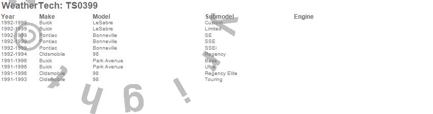Below is an abbreviated list of applications for the WeatherTech SunShade.98, Bonneville, LeSabre, Park Avenue, Buick, Oldsmobile, Pontiac, 1999, 1998, 1997, 1996, 1995, 1994, 1993, 1992, 1991