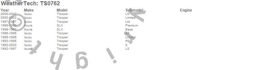 Below is an abbreviated list of applications for the WeatherTech SunShade.SLX, Trooper, Acura, Isuzu, 2002, 2001, 2000, 1999, 1998, 1997, 1996, 1995, 1994, 1993, 1992