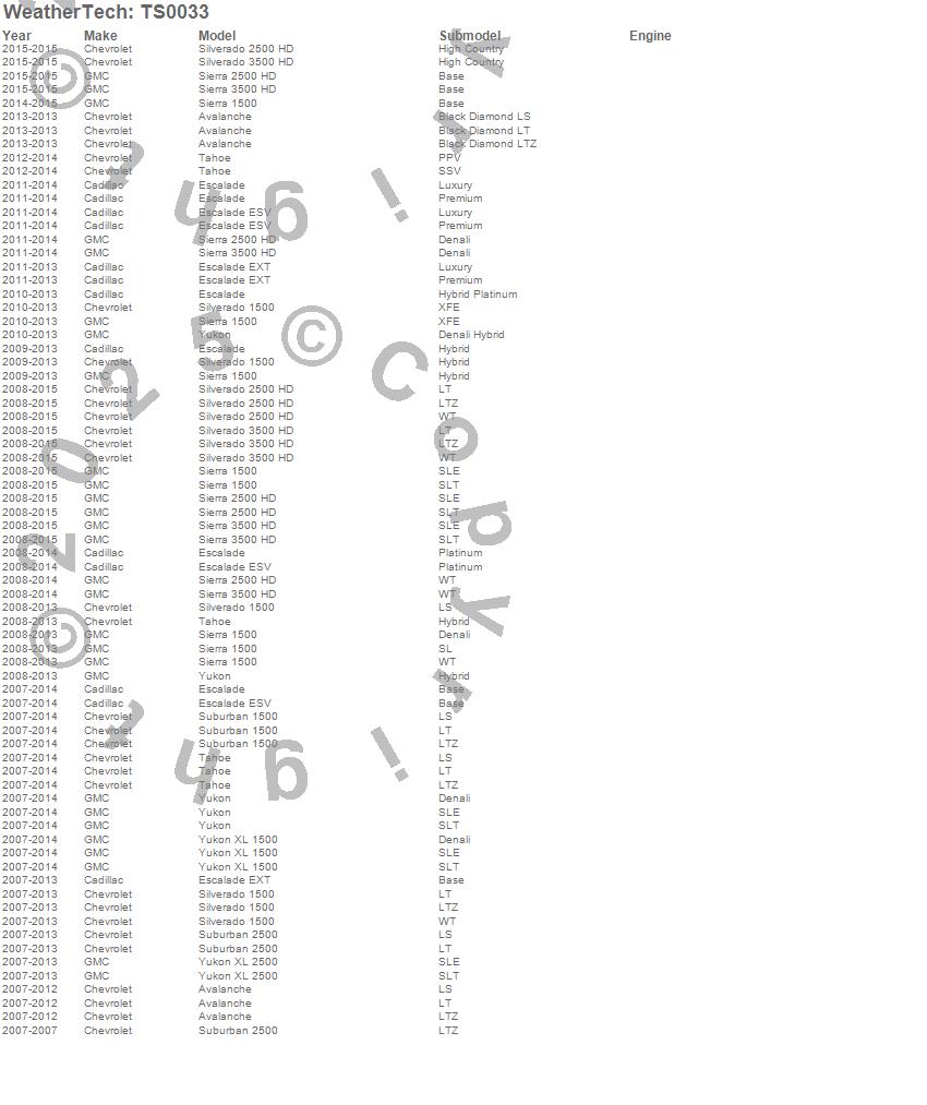 Below is an abbreviated list of applications for the WeatherTech SunShade.Avalanche, Escalade, Escalade ESV, Escalade EXT, Sierra 1500, Sierra 2500 HD, Sierra 3500 HD, Silverado 1500, Silverado 2500 HD, Silverado 3500 HD, Suburban 1500, Suburban 2500, Tahoe, Yukon, Yukon XL 1500, Yukon XL 2500, Cadillac, Chevrolet, GMC, 2015