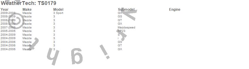 Below is an abbreviated list of applications for the WeatherTech SunShade.3, 3 Sport, Mazda, 2009, 2008, 2007, 2006, 2005, 2004
