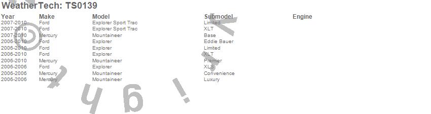 Below is an abbreviated list of applications for the WeatherTech SunShade.Explorer, Explorer Sport Trac, Mountaineer, Ford, Mercury, 2010, 2009, 2008, 2007, 2006