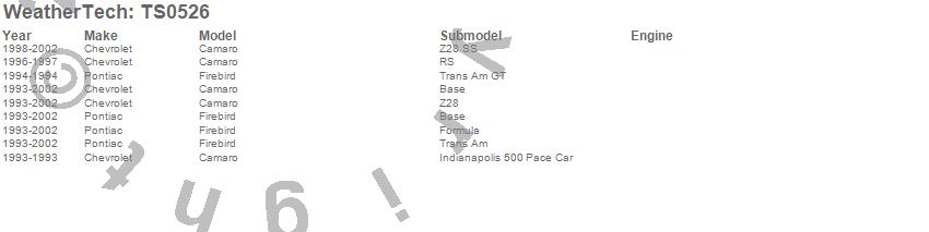 Below is an abbreviated list of applications for the WeatherTech SunShade.Camaro, Firebird, Chevrolet, Pontiac, 2002, 2001, 2000, 1999, 1998, 1997, 1996, 1995, 1994, 1993
