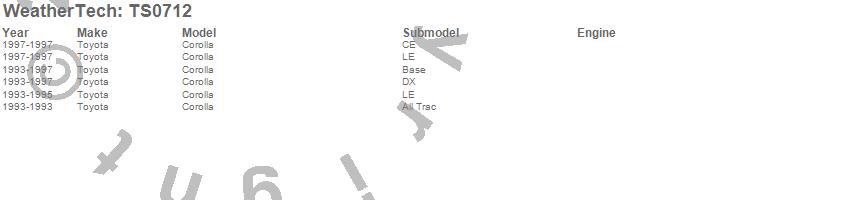 Below is an abbreviated list of applications for the WeatherTech SunShade.Corolla, Toyota, 1997, 1996, 1995, 1994, 1993