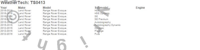Below is an abbreviated list of applications for the WeatherTech SunShade.Range Rover Evoque, Land Rover, 2016, 2015, 2014, 2013, 2012