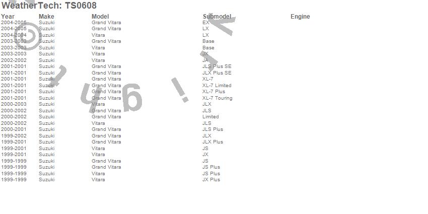 Below is an abbreviated list of applications for the WeatherTech SunShade.Grand Vitara, Vitara, Suzuki, 2005, 2004, 2003, 2002, 2001, 2000, 1999