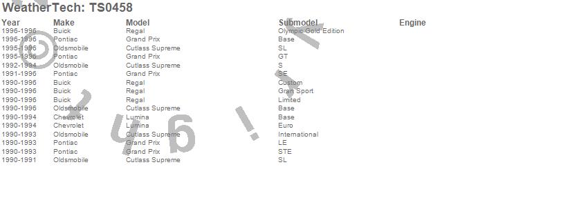 Below is an abbreviated list of applications for the WeatherTech SunShade.Cutlass Supreme, Grand Prix, Lumina, Regal, Buick, Chevrolet, Oldsmobile, Pontiac, 1996, 1995, 1994, 1993, 1992, 1991, 1990