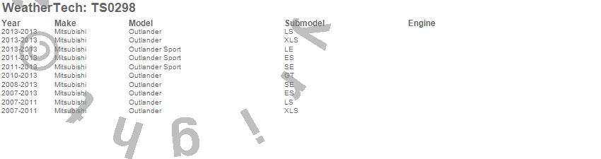 Below is an abbreviated list of applications for the WeatherTech SunShade.Outlander, Outlander Sport, Mitsubishi, 2013, 2012, 2011, 2010, 2009, 2008, 2007