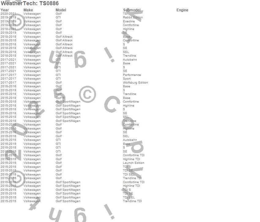 Below is an abbreviated list of applications for the WeatherTech SunShade.Golf, Golf Alltrack, Golf R, Golf SportWagen, GTI, Volkswagen, 2021, 2020, 2019, 2018, 2017, 2016, 2015