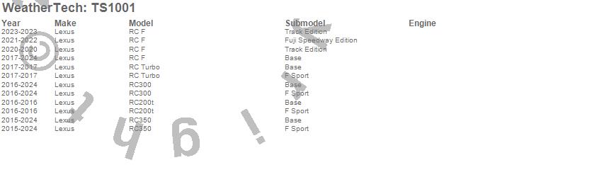 Below is an abbreviated list of applications for the WeatherTech SunShade.RC F, RC Turbo, RC200t, RC300, RC350, Lexus, 2024, 2023, 2022, 2021, 2020, 2019, 2018, 2017, 2016, 2015