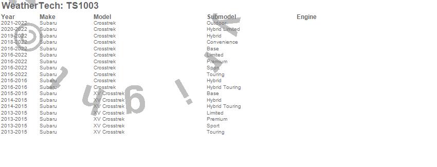 Below is an abbreviated list of applications for the WeatherTech SunShade.Crosstrek, XV Crosstrek, Subaru, 2022, 2021, 2020, 2019, 2018, 2017, 2016, 2015, 2014, 2013
