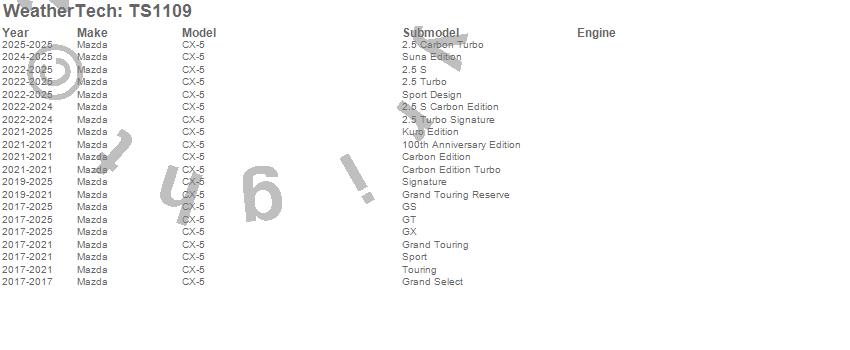 Below is an abbreviated list of applications for the WeatherTech SunShade.CX-5, Mazda, 2025, 2024, 2023, 2022, 2021, 2020, 2019, 2018, 2017