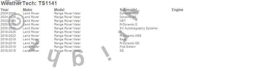 Below is an abbreviated list of applications for the WeatherTech SunShade.Range Rover Velar, Land Rover, 2026, 2025, 2024, 2023, 2022, 2021, 2020, 2019, 2018