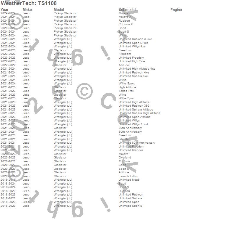 Below is an abbreviated list of applications for the WeatherTech SunShade.Gladiator, Pickup Gladiator, Wrangler, Wrangler (JL), Jeep, 2026, 2025, 2024, 2023, 2022, 2021, 2020, 2019, 2018