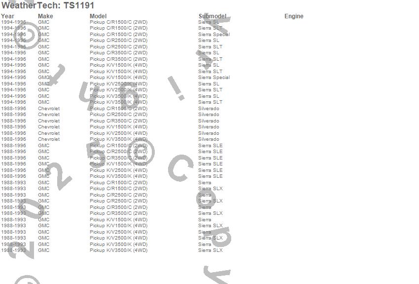 Below is an abbreviated list of applications for the WeatherTech SunShade.C1500 Pickup, C2500 Pickup, C3500 Pickup, K1500, K1500 Pickup, K2500 Pickup, K3500 Pickup, Chevrolet, GMC, 1996, 1995, 1994, 1993, 1992, 1991, 1990, 1989, 1988