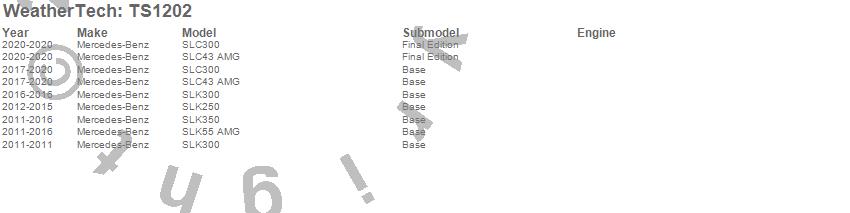 Below is an abbreviated list of applications for the WeatherTech SunShade.SLC300, SLC43 AMG, SLK250, SLK300, SLK350, SLK55 AMG, Mercedes-Benz, 2020, 2019, 2018, 2017, 2016, 2015, 2014, 2013, 2012, 2011
