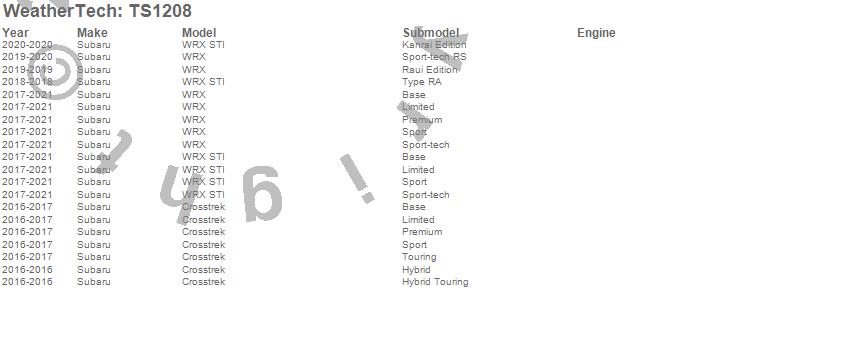 Below is an abbreviated list of applications for the WeatherTech SunShade.Crosstrek, WRX, WRX STI, Subaru, 2021, 2020, 2019, 2018, 2017, 2016