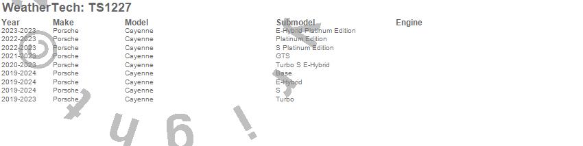 Below is an abbreviated list of applications for the WeatherTech SunShade.Cayenne, Porsche, 2025, 2024, 2023, 2022, 2021, 2020, 2019