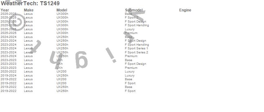 Below is an abbreviated list of applications for the WeatherTech SunShade.UX200, UX250h, UX300h, UXh, Lexus, 2025, 2024, 2023, 2022, 2021, 2020, 2019