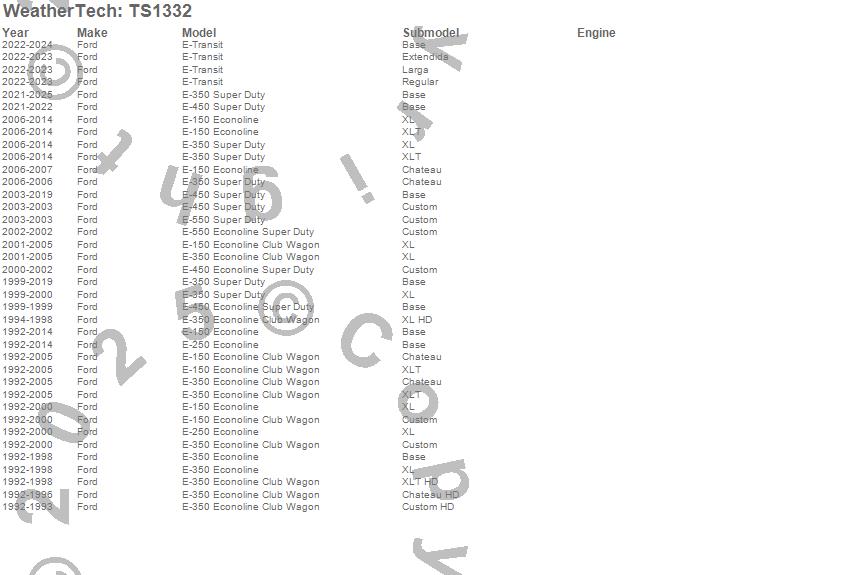 Below is an abbreviated list of applications for the WeatherTech SunShade.E-150 Econoline, E-150 Econoline Club Wagon, E-250 Econoline, E-350 Econoline, E-350 Econoline Club Wagon, E-350 Super Duty, E-450 Econoline Super Duty, E-450 Super Duty, E-550 Econoline Super Duty, E-550 Super Duty, E-Transit, Ford, 2026, 2025, 2024, 2023, 2022, 2021, 2019, 2018