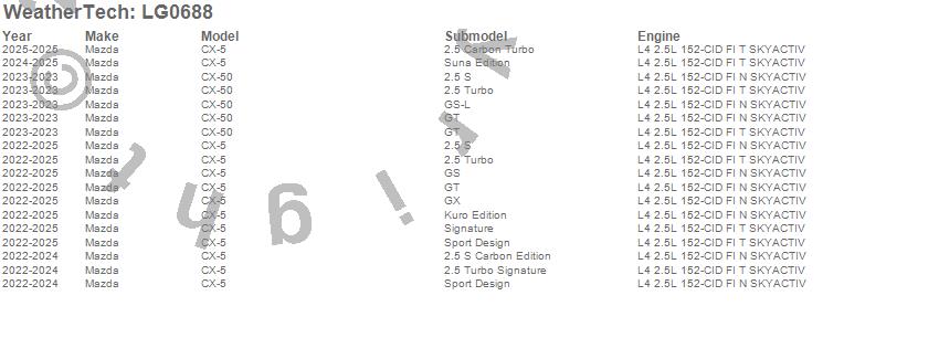 Below is an abbreviated list of applications for the LampGard.CX-5, CX-50, Mazda, 2025, 2024, 2023, 2022