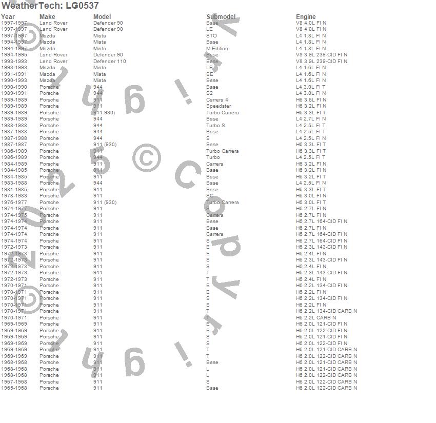 Below is an abbreviated list of applications for the LampGard.911, 944, Defender 110, Defender 90, Miata, Land Rover, Mazda, Porsche, 1997, 1996, 1995, 1994, 1993, 1992, 1991, 1990, 1989, 1988, 1987, 1986