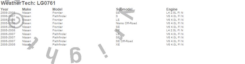 Below is an abbreviated list of applications for the LampGard.Frontier, Pathfinder, Nissan, 2008, 2007, 2006, 2005
