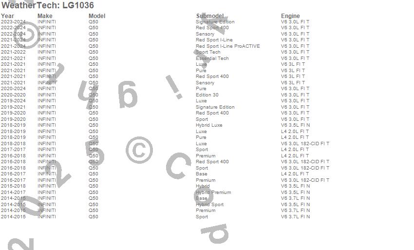 Below is an abbreviated list of applications for the LampGard.Q50, INFINITI, 2024, 2023, 2022, 2021, 2020, 2019, 2018, 2017, 2016, 2015, 2014