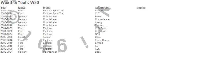 Below is an abbreviated list of applications for the All Weather Floor Mats.Aviator, Explorer, Explorer Sport Trac, Mountaineer, Ford, Lincoln, Mercury, 2010, 2009, 2008, 2007, 2006, 2005, 2004, 2003, 2002