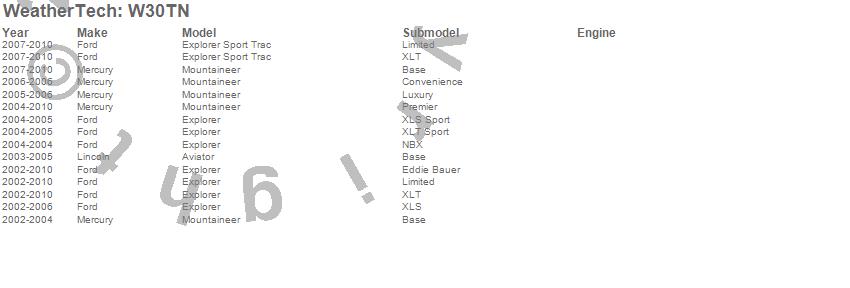Below is an abbreviated list of applications for the All Weather Floor Mats.Aviator, Explorer, Explorer Sport Trac, Mountaineer, Ford, Lincoln, Mercury, 2010, 2009, 2008, 2007, 2006, 2005, 2004, 2003, 2002