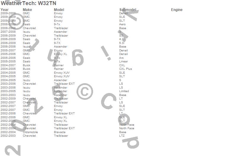 Below is an abbreviated list of applications for the All Weather Floor Mats.9-7X, Ascender, Bravada, Envoy, Envoy XL, Envoy XUV, Rainier, Trailblazer, Trailblazer EXT, Buick, Chevrolet, GMC, Isuzu, Oldsmobile, Saab, 2009, 2008, 2007, 2006, 2005