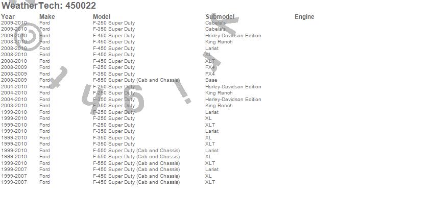 Below is an abbreviated list of applications for the FloorLiner DigitalFit.F-250 Super Duty, F-350 Super Duty, F-450 Super Duty, F-550 Super Duty, Ford, 2010, 2009, 2008, 2007, 2006, 2005, 2004, 2003, 2002, 2001, 2000, 1999