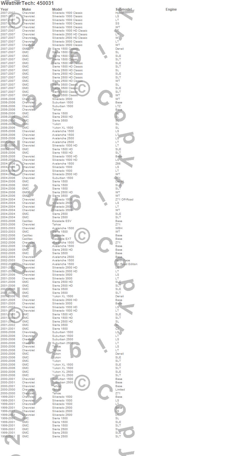 Below is an abbreviated list of applications for the FloorLiner DigitalFit.Avalanche 1500, Avalanche 2500, Escalade, Escalade ESV, Escalade EXT, Sierra 1500, Sierra 1500 Classic, Sierra 1500 HD, Sierra 1500 HD Classic, Sierra 2500, Sierra 2500 HD, Sierra 2500 HD Classic, Sierra 3500, Sierra 3500 Classic, Silverado 1500, Silverado 1500 Classic, Silverado 1500 HD, Silverado 1500 HD Classic, Silverado 2500, Silverado 2500 HD