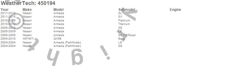 Below is an abbreviated list of applications for the FloorLiner DigitalFit.Armada, Armada (Pathfinder), QX56, INFINITI, Nissan, 2015, 2014, 2013, 2012, 2011, 2010, 2009, 2008, 2007, 2006, 2005, 2004