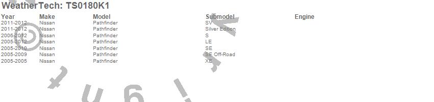 Below is an abbreviated list of applications for the WeatherTech SunShade Full Vehicle Kit.Pathfinder, Nissan, 2012, 2011, 2010, 2009, 2008, 2007, 2006, 2005