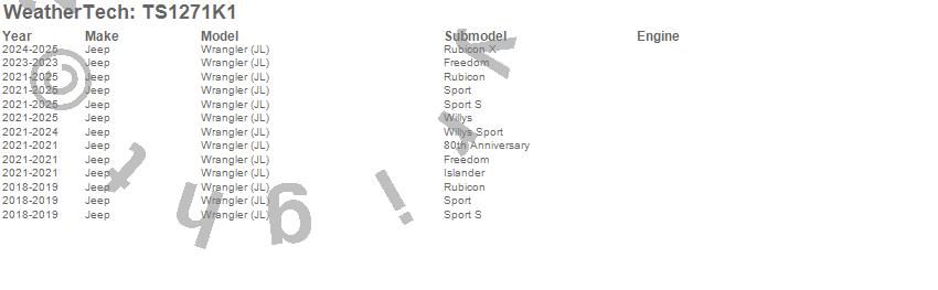 Below is an abbreviated list of applications for the WeatherTech SunShade Full Vehicle Kit.Wrangler, Wrangler (JL), Jeep, 2026, 2025, 2024, 2023, 2022, 2021, 2019, 2018