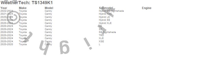 Below is an abbreviated list of applications for the WeatherTech SunShade Full Vehicle Kit.Camry, Toyota, 2024, 2023, 2022, 2021, 2020